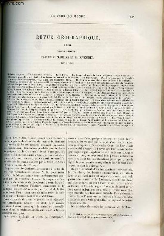Le Gothard est percé - victimes de l'entreprise - Louis Favre - Basisns commerciaux du Gothard et du Mont Cernis - tunnel projeté du Mont Blanc - le voyage du colonel Prjévalski - Mission de Soleillet au Sénégal - le Loukouga exploré par Hore. Voyage aux Etats Unis - le prfesseur Nordenskiold et le commandant Palander en Europe. le cours du rio Chagres ne sera pas un obstacle au percement du tunnel. Départ du Corvin à la recherche de la Jeannette,etc... Classification Dewey : 70.4412-Le journal des voyages