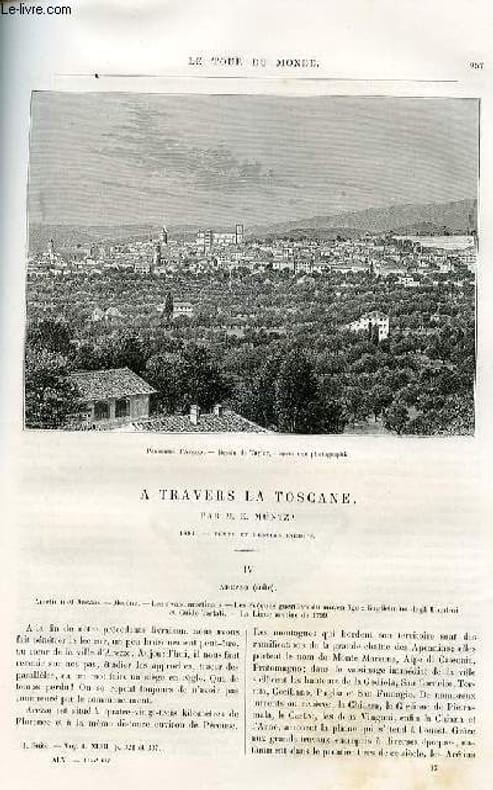 Arezzo,illustré dans le texte de gravures de vases arétins,,de gravures pleine page : Palazzo della Fraternita à Arezzo ; verrière de Guillaume de Marcillat à la cathédrâle d'Arezzo. Gravure dans le texte en première page de la livraison 1165: la Vierge avec l'enfant Jésus et des saints (terre cuite émaillée de l'école des della Robbia). La place de la Cathédrâle et les remparts de Guido Tarlati. L'église St François et les fresques de Piero della Francesca,illustré d'une gravure pleine page de l'Exaltation de la Croix par Piero Francesca. La palce du peuple à Arezzo,illustré d'une gravure. La maison de Vasari,illustré de gravures dont: retable de Spinello Aretino,église St- Dominique.Le couvent de Santa Maria delle Grazie. Gravure pleine page de Santa Maria del Calcinajo sur la route de Cortone. Cortone-la stella d'Oro,illustré de gravures: une rue de Cortone,un sarcophage antique. La cathédrâle de Cortone et le Gesu - Fra Angelico et Signorelli,illustré dans le texte de l'Annonciation par Fra Angelico. Musée étrusque - la Muse et le Lampadaire,illustré dans le texte d'une gravure de muse ou cithariste (musée de cortone). La maison de Pierre de Cortone,illustré 'une gravure de palais prétorien. Couvent de Ste Marguerite en pleine page. La Madonna del Calcinajo. une journée à Fiesole,illustré de gravures dont un panorama de Fiesole,la grande place de fiesole (la cathédrâle et le séminaire). La Cathédrâle,illustré dans le texte de gravures: buste de l'évêque Salutati par Mino de Fiesole, la Madonne avec l'enfant Jésus et des saints , bas relief par Fiesole. Classification Dewey : 70.4412-Le journal des voyages