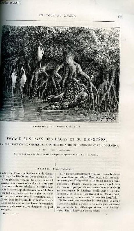 Exposé géographique illustré d'une carte dans le texte du bagatay ou pays des bagas, d'une gravure dans le texte d'un marigot par Pranishnikoff. Mission du Goeland, le pilote Seymou - Camfarandi - Victoria - Catinou - le balafon illustré d'une gravure pleine page de l'arrivée de Dinah syr le Goëland. Dinah Salifou - le boubou - chef de Boffa illustré de gravures dans le texte dont portrait de Dinah Salifou,Tomba Couyé dans la vase, gravure pleine page de l'arrivée au Petit Talibonche, gravures de cases au Peitt Talibonche. L'île de Sable. Voyage au village de Coffin - Kassan - l'ipéca et le collyre - rencontre de Simons - Catombé illustré de gravures dans le texte dont une près du village Catombé, et rencontre de Simons. Gravure pleine page de femmes du village de Coffin construisant une case. Le Grand Talibonche avec gravure dans el texte de l'antichambre d'une case au village de Coffin et place du Grand talibonche. L'ardent revient du Cassini et repart pour le Pongo illustré d'une gravure pleine page du débarcadère du Grand Talibonche. Le kola (sterculia acummata) illustré de deux gravures dans le texte: le fruit du kola et l'arbre kola par Pranishnikoff. Villages voisins de la factorie de Bel Air - visite à Casasocobouly - le roi Youra Towel - règles de succession chez les rois malous avec portrait dans le texte de Youra Powel. Le roi des Landoumans - visite à Boké - Jean bayol - Simons. Sortie du rio nunez - les trombes, illustré de gravures dans le texte dont la porte de Casasocobouly et Menga Sera et d'une gravure pleine page des trombes sur la mer. Classification Dewey : 70.4412-Le journal des voyages