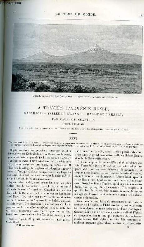Visite au couvent d'Etchmiadzine -le climat et l'aspect d'Erivan - départ de nuit pour Aralych - village de Koïlassar et les Aïssores avec gravures dans le texte. Le poste frontière d'Aralych - le village - arrivée au col de Sardar-Boulak illustré d'une gravure pleine page du grand Ararat vu du campement des Cosaques. Massif du Grand et du Petit Ararat - Col de Sardar Boulak - beauté de paysage - prière de jeux des Cosaques illustré d'une carte dans le texte du massif de l'Ararat. Excursion au campement de petchara - Djavo Bek Chamchadinoff illustré d'une gravure pleine page d'un campement kurde de Petchara, une autre gravure pleine page des jeunes filles de Sardar Boulak. Gravure dans le texte d'un kurde: Djelali de Petchara. Village kurde d'hiver - flore - spect du sol - arrivée à Arkhouri - Orage avec gravures dans le texte (intérieur d'une tente kurde, campement des Kurdes Djelali de Sardar Boulak). Le Grand Ararat - le village d'Arkhouri - excursion à la fontaine de Saint Jacob avec gravures dans le texte (tente de Charo, Gullu Khanoum) et gravures pleine page (le Kip-gol, bergers kurdes). Intérieur tatar - difficultés pour aller au Kip-Göl - le Kurde Charo - vendetta - le starchina Yoursoup Bek avec uen gravure dans le texte de femmes tatares d'Arkhouri. Excursion au Kip Göl - halte chez Charo - moeurs kurdes illustré d'une gravure pleine page de la traite des chèvres et de gravures dans le texte (le nouvel Arkhouri, le Grand Ararat vu de la fontaine Saint Jacob). L'indisposition de Kévork - en route pour Khorgane, le village, la source - les ruines du campement de Khorgane illustré de gravures dans le texte. Descente sur Igdir - série de sept cratères - les canaux d'Igdir et leurs inconvénients - grande variété de Kurdes à Igdir - station de Karakalah illustré de gravures dans le texte des ruines de Khorganes et de la tour funéraire à Karakalah et d'une gravure pleine page des ruines de Karakalah sur l'Araxe. Le plateau de Karakalah, les ruines, le cimetière - Sourmalou - Arrivée à Koulpe - Sa haute antiquité - visite des mines - excursion aux ruines d'Erovantachad et d'Erovantagherd - traversée de l'Araxe et de l'Arpa-Tchaï - Hadji-Beïramlou avec gravure dans le texte d'une vue du village de Koulpe et d'une autre gravure dans le texte des ruines d'Erovantagherd. Gravure pleine page des mines de sel de Koulpe. Rétour à Erivan - dernière traversée de l'Araxe - Chagriar - Armavir - Utch-Kilisa - arrivée à voiture à Erivan avec gravures dans le texte. Court arrêt à Erivan - Bach Garni - Kéghart illustré de gravures dans le texte (sculptures du temple de Tiridate, la vallée du Garni Tchaï) et d'une gravure pleine page (intérieur de l'église pendant la fête). Classification Dewey : 70.4412-Le journal des voyages