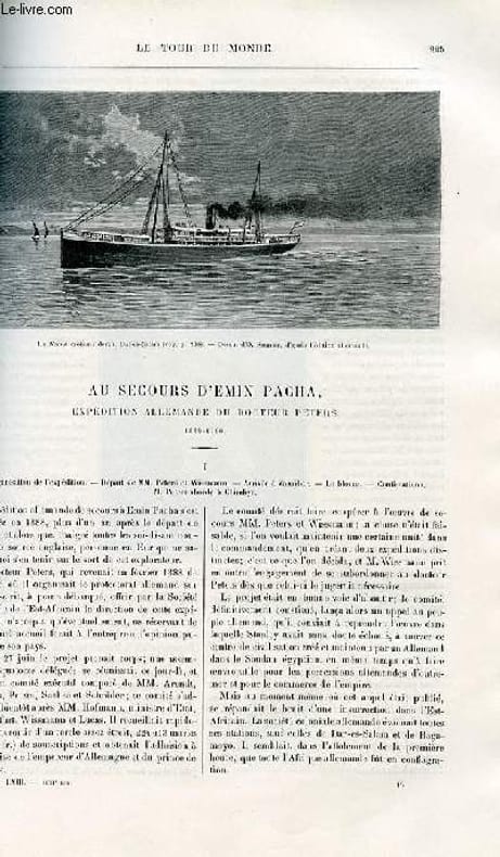 Organisation de l'expédition - départ de Peters et Wissmann - arrivée à ZAnzibar - blocus - confiscations - Peters aborde à Chimbye illustré de gravures dans le texte(la neera, le lieutenant de Tiedemann et portrait du docteur Peters). Départ de Hindi - à Vitou - ambassade des Somalis-Kavallatas avec carte dans le texte de l'itinéraire de l'expédition et illustré également d'une gravure pleine page d'un transbordement sur les daous. Portrait dans le texte du capitaine Rust. Ngao - passage du Tana - arrivée à Oda- Borourouva avec gravures dans le texte et gravure pleine page d'une bataille contre les gallas. A Oda- Borou - Rouva avec gravures dans le texte. Départ - les chutes du Tana - luttes avec les indigènes - les Ouandorobbos - les Ouakambas - le Kénin avec gravures dans le texte dont les monts Guillaume II et gravures pleine page (entrevue avec les ouandorobbos, chute Charles Alexandre. Le Kikouyou - chez les Massaïs - guerre - éclipse du soleil - nuit de Noêl - arrivée au lac Baringo illustré d'une gravure pleine page d'une attaque de Massaïs. Du Baringo au Kavirondo - arrivée à Koua - Sakoua - nouvelles de Stanley et Emin - à Koua Soundou illustré de gravures dans le texte et d'une gravure pleine page (attaque des Oua-Elgedjo). Marche vers l'Ounyoro - Ossogo - terrible accident - Wachoré avec gravures dans le texte et gravure pleine page de la réception de Wachoré où le lieutenant De Tiedemann tua involontairement deux hommes. Dans l'Ouganda - chez Mouanga - la mission catholique française - traité avec Mouanga - intrigues du parti anglais illustré de nombreuses gravures dans le texte et en pleine page. Classification Dewey : 70.4412-Le journal des voyages