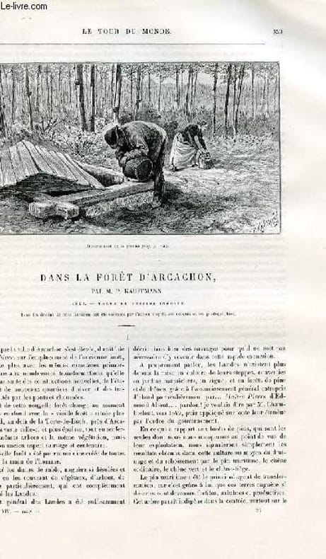 Illustré de gravures dans le texte: déversement de la gemme, la tournée de l'usinier, raclage de l'écorce, pose du crampon, puits près de la cabane, piquage avec le hapchott à échelons, piquage du pin au hapchott, piquage de haut au pitey, garde-feu, déversement de la gemme. Illustré de gravures pleine page : cabane de résinier , types de résiniers, remplissage des barriques. 25 petites gravures dans le texte des outils du résinier (grand pitey, hapchottà échelons, hapchott, sarcle à pela, sarcle à brasqua ou barraquite,pousse-crampon,maillet,escouarte,peyre à aguada et son affiloir, toupin, etc..). Illustré d'autres gravures dans le texte : création des nuages artificiels, mise en nattes et dammage du barras, aiguisage des outils, confection de la chandelle,abatage du bois mort, déchargement du bois,station de chemin de fer dans les Landes, facteur rural sur des échasses. Illustré aussi de gravures pleine page: intérieur d'une cabane de résinier, attelages pour le chargement des barriques, récolte du barras. Classification Dewey : 70.4412-Le journal des voyages