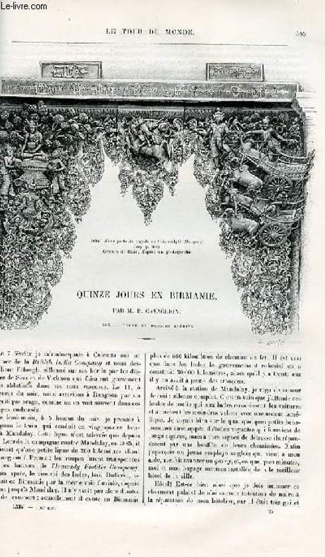 Illustré de gravures dans le texte: détail d'une porte de pagode en bosi sculpté, le jeu de polo d'après une peinture birmane, le jeu de balle ou foot-ball birman (toujours d'après une peinture birmane), l'Irawady, grande cloche sur le parvis de la pagode de Rangoon, danseuses, bouddhas, grande pagode de Rangoon, dames birmanes, tapis. Gravures pleine page: palais de la reine Sopia - Lat dans la cité royale de Mandaly, l'Incomparable pagode de Mandalay, rue de Mandalay. Classification Dewey : 70.4412-Le journal des voyages