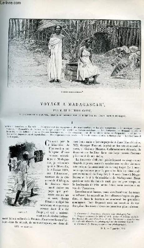 Arrivée à Tamatave-indiens malabars-la batterie hova-Rainandriamanpandry-le commencement de la saison sèche-les borizano et les filanjana. Un kabary de porteurs-Rainivoivy et Jean Boto-Ivondrona-Ambodisiny-légende de Darafify-Ankaréfo-Vavony-Tanimandry,illustré d'une gravure pleine page de l'embarquement des boeufs, d'une de la cruche d'Ambodisiny et une des lagunes. Le rofia et le ravinala-Manambonitra-Beforona-Ranomafana-Ampasimpotsy-Moramanga-vallée de Sabotsy-Ankeramadinika,illustré de gravures dont : Filanjana dans la forêt. Tananarive-Mahamasina-quartier d'Ambatovi naky-marché du Zoma-Rainilaiarivony,illustré de gravures dont: marchands de manioc; vue générale de Tananarive. La province de l'Imerina-le massif de l'Ankaratra-légende de Tsiafajavona-Ankisatra-passage de l'Onivé-Sarobaratra-Tsinjoarivo,illustré d'une carte dans le texte du voyage à Madagascar, gravures: chant des borizano,esclaves vannat du riz,revue des troupes à Ambohiponana. Betafo-Soavina-déjeuner chez le chef Abraham Ratsimiharo - Ambohimanambola-lac Itasy-Fenoarivo,illustré de gravures dont : boeuf-cheval et porte fortifiée. Le Mangoro-Anosibé-Mahanoro-les modes à Ambalavero,illustré de gravures: le lac Itasy, types Hova. Classification Dewey : 70.4412-Le journal des voyages