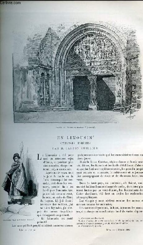 "Les dessins de ces deux livraisons ont été exécutés d'après nature par Gaston Vuillier. Nombreuses gravures dans le texte: portail de l'église de Beaulieu gravé par Barbant, costume traditionnel des femmes (en petit) par Bazin,,une journalière du bas-pays par Rousseau,châtellenie de Saint Genies O Merle (Ruffe),la maison de l'abbé à Tulle (Verdoux),le tour de la lunade, la redole et l'inferno gravées par Ruffe,le retable de Naves (Barbant),la cathédrâle d'Uzerche (Verdoux),le saut de la Virolle (Ruffe). Gravures pleine page: la ventes des chevelures (Rousseau),le ""saut"" ou grande cascade (Ruffe), la Gouttatière ou queue de cheval et le fantôme, gravées par Ruffe; Uzerche la nuit (Ruffe). Classification Dewey : 70.4412-Le journal des voyages"
