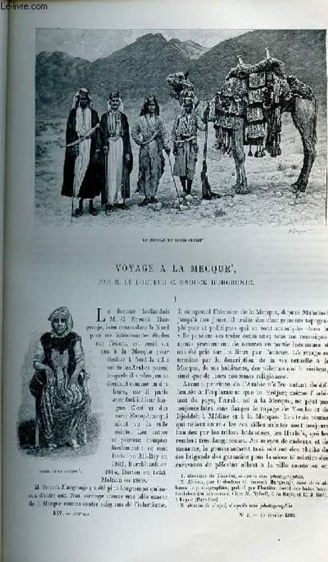 Carte de la Mecque d'après le docteur C. Snouck Hurgronje. Deux gravures dans le texte: panoramas de la Mecque. Gravures dans le texte:le chameau du grand chérif (gravé par Thiriat), femme de la Mecque, Aoun Er Rafio,grand chérif de la Mecque,le hamidyjah (palais du gouvernement),Othman Pacha conduisant le Mahmal égyptien,le Rikah (siège sur lequel on place la fiancée pendant la nuit du Douchlah),un morceau du Kiswah, réunion annuelle des pélerins dans la vallée de la Mouna,le mont Arafat pendant le pélerinage. Gravures pleine page: fiancée de la Mecque, dessin de Lavée,gravé par Barbant, la mosquée pendant le Calat (gravée par Bocher). Classification Dewey : 70.4412-Le journal des voyages