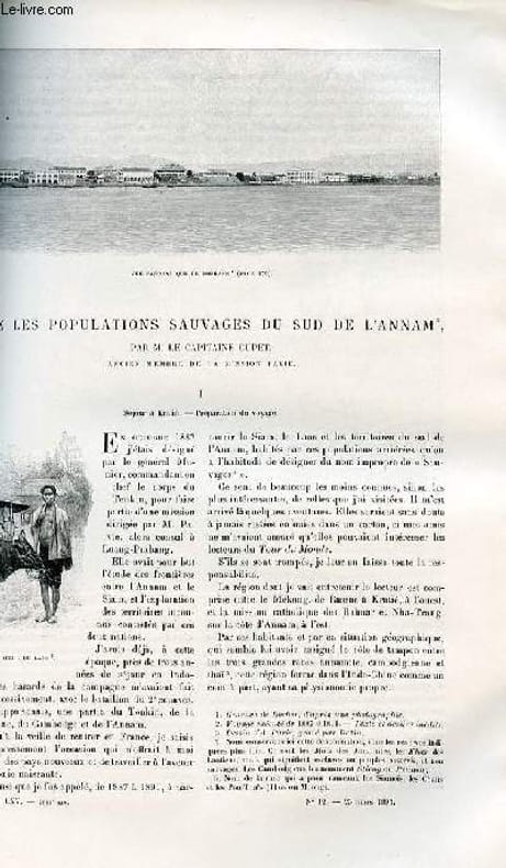 Séjour à Kratié-préparation du voyage,illustré de gravures dont le passage du Prek-Té. De Kratié à Pou-Lo-Pou-Klia-l'Ang-kiet-départ par Ban-Dôn,illustré de gravures: entrevue avec l'Ang-Kiet,campement au bord d'une mare. De Ban-Dôn à Ban-Khasom-les Radé-Ban-Khasom-sorcier du feu,illustré de gravures dont un rai ou défrichement,entrevue avec le sorcier du feu. De Ban-Khasom à la mission catholique des Bahnar-rencontre de commerçants annamites, illustré d'une gravure des habitants en armes viennent nous reconnaitre. Séjour à la mission catholique des Bahnar-état social,moeurs et coutumes des sauvages,illustré de gravures dont : Dout,arrivée en présence des habitants,le reulang,notre arrivée dans un village qui n'apas été prévenu (l'alarme). Départ pour Attopeu-rencontre des Laotiens-le Kébo. En route pour Ban-Dôn-le Sadète de l'eau-rencontre de la colonne laotienne,illustré de gravures: changement des porteurs,sacrifice aux génies,arrivée dans un village ami. Recul de la colonie laotienne-bloqué à Ban-Dôn-arrivée de Sanh. Mépreut-les Radé-le Mé-Sao-Ninh-Hoa-Nha Trang,illustré de gravures dont une d'un incident chez le Mépreut, une caravane annamite,échange avec les sauvages. Classification Dewey : 70.4412-Le journal des voyages
