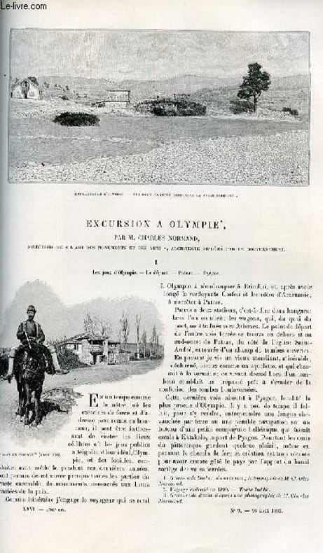 Les jeux d'Olympie - le départ - Patras - Pyrgros, illustré d'une carte dans le texte d'un plan d'Olympie légendé et du plan du temple de Zeus ; gravures: le terrain des fouilles (Olympie), le Gymnase. Le trésor des cités grecques - le théâtre et l'hippodrome- les habitations des prêtres et des magistrats,illustré de gravures dont : l'Héraion et, dans le texte: fragments de la mosaïque du Pronaos ou vestibule, plan de l'atelier de Phidias,plan de l'Héraion. Classification Dewey : 70.4412-Le journal des voyages