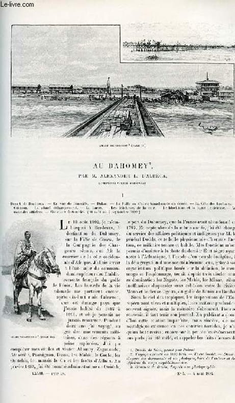 En vue de Ténérife - Dakar - la ville de Céara transformée en écurie - la côte des esclaves - Cotounou-le wharf, débarquement,illustré de gravures dont: passage de la barre. nos traités avec le Dahomey- 1889-mission Bayol - 1890 colonne Terrillon - 1891 Béhanzin - 1892 Attaque d'une canonnière-colonel Dodds,illustré de gravures dont: artilleurs haoussas et compagnie du débarquement du Mytho à Cotonou,illustré d'une carte dans le texte du royaume de Porto Novo, d'une gravure d'un combat de la Topaze. en pirogue sur le lac Nokoué-les empalés d'Aouansori- Ouémé- Porto Novo -roi Toffa , illustré d'une gravure des empalés d'Aouansori,dessin de Marius Perret gravé par Clément Bellenger, une autre gravure sur un palabre chez Toffa. Marche sur Abomey-combat de dogba-poguessa- Adégon-la-mort, illustré dans le texte de l'itinéraire de Dogba à Abomey, de gravures dont: combat de Dogba le 19 septembre 1892. Enlèvement du pont d'Adegon-marche sur Oumbouémédi-les Dahoménes en campagne-Akpa-le Coto,illustré d'une gravure de l'enlèvement du pont d'Adégon. Andéoud - Pobiry et les Ouatchis - Cotopa-cana, illustré de gravures dont une du camp de la soif (la tornade), et d'une autre gravure sur le bivouac place d'Abomey; gravure dans le texte de bas-relief et fresques des palais d'Abomey. Béhanzin à Atchéribé - marche sur Agony - Haut Ouémé - Zagnanado -le Zou - bivouac de Zoutenou - le colonel Dumas à Savalou,illustré de gravures: Behanzin arrivant au poste de Goho, couronnement du roi Agoliagbo, carte du Dahomey (pleine page) d'après les travaux topographiques les plus récents, le tam-tam des Cabécères. Classification Dewey : 70.4412-Le journal des voyages