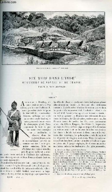 Extrait du volume Sechs monate in Indien,récit d'un voyage exécuté en 1887 et 1888 par le duc Ernest Gonthier de Schleswig-Holstein. Bombay-Ceylan,illustré d'une gravure d'une rue de Haïderabad. Madras et haïderabad,illustré d'une gravure d'un Sheep Cutting, une autre gravure d'une chasse à l'antilope. Chasses dans le Travankôr,illustré de gravures dont: danse dans les montagnes, ; devant Djounagarh. le catch et le Kattyawar, illustré de gravures dont: dans l attente (gravé par Privat). Radjpoutana -dernières chasses. Classification Dewey : 70.4412-Le journal des voyages