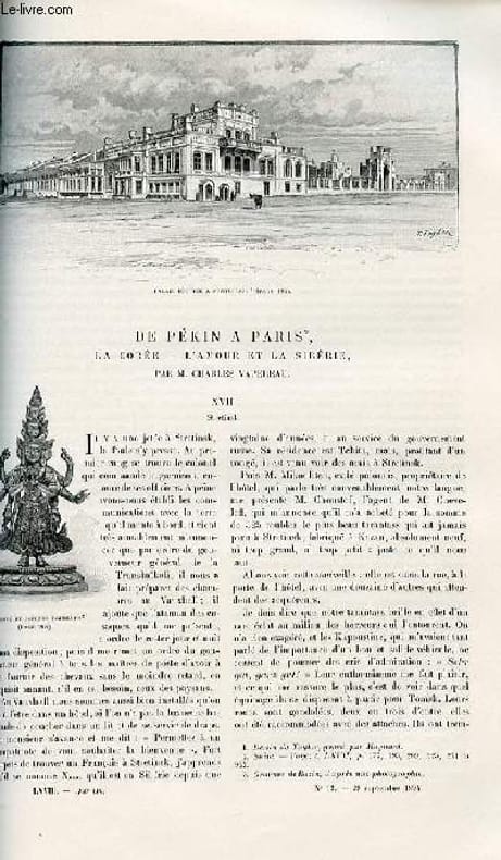 "Stretinsk- de Stretinsk à Tchita,illustré de gravures dont: aux mines d'or; prêtres-musiciens bouriates; bords de l'Ingoda. de Tchita à Irkoutsk,illustré de gravures dont: Polovinnaya,Irkoutsk. Krasnoïarsk,illustré d'une gravure d'un convoir d'émigrants. de krasnoïarsk à Tomsk,illustré d'une gravure : en tarantass,une descente.Tobolsk,illustré d'une gravure d""une procession à Tomsk et d'une gravure dans le texte d'un berceau sibérien. De Tobolsk à Paris,illustré d'une gravure de personnel d'une ferme. Classification Dewey : 70.4412-Le journal des voyages"