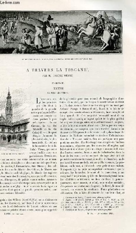 Le Palais des Offices - le musée des Offices (histoire et organisation) - les Antiques, avec pleine page de portraits de la galerie des offices (16 portraits dont Verrocchio,carlo Dolci,Holbein,Ernest Liotard,H. Flandrin,Angelica Kauffmann,Alfieri,etc...). Les Peintures des Ecoles italiennes,illustré de deux gravures hors texte : la place de Santa Croce et l'église San Firenze. La Peinture : les écoles étrangères,illustré de deux gravures hors texte de l'intérieur de Santa Croce et la chapelle des Pazzi. Les Portraits d'artistes peints par eux-mêmes. Santa Croce - les fresques de Giotto et de son école, illustré d'une gravure d'une cour du Bargello. Le cloitre - la chapelle des Pazzi (Santa Croce) - le Bargello,palais du Podestat ou musée national,illustré de gravures: le Bargello , la salle des bronzes. La place et l'église de l'Annonciation,avec gravures de l'église de l'Annonciation et cloître de la Badia. La Casa Buonarroti - Santa Maria Maddalena dei Pazzi - l'académie des Beaux arts (galerie ancienne et moderne. Le couvent de Saint MArc - Fra Angelico et Savonarole avec gravures hors texte du couvent de St Marc (le 1er et le second cloître, un des dortoirs,la cellule de Savonarole) - le palais Capponi-dans la via de Bardi ; gravure hors texte de la façade postérieure du palais Pitti. la rive gauche de l'Arno - le palais Pitti, illustré de gravures hors texte: choix de tableaux du palais Pitti (reproductions dont les quatre philosophes par Rubens, la nourrice des Médicis par Paris Bordone,etc..). Le jardin Boboli - San Spirito et le Carmine. Classification Dewey : 70.4412-Le journal des voyages