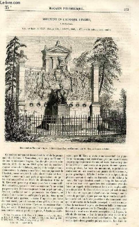 Monument en l'honneur d'Ingres à Montauban avec gravure dans el texte de ce monument dans le Tarn et Garonne. Histoire des instruments de musique,suite - l'orgue , son histoire, ses progrès. Causeries hygiéniques, la salubrité des rues, suite. Le pagure larron avec gravure dans le texte de cet animal. Mémoires d'Edward Lord Herbert de CHerbury (1598-1648),suite. Classification Dewey : 70.4413-Magasin pittoresque, universel et mosaïque
