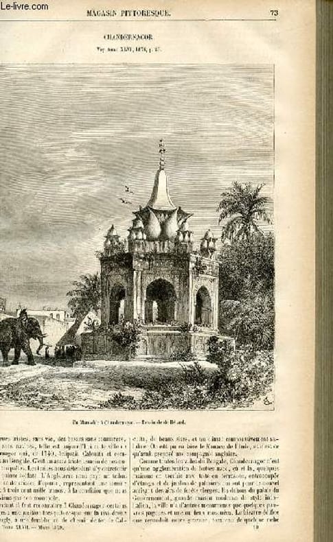 Chandernagor avec gravure dans le texte d'un mausolée à Chandernagor. Bois et gazons sur les montagnes. Victor Honoré Janssens avec gravure dans le texte de al Main chaude par Victor Honoré Janssens. Notes sur la prononciation française, suite. Aiguière au 15ème siècle avec gravure dans le texte d'une aiguière en vermeil. Classification Dewey : 70.4413-Magasin pittoresque, universel et mosaïque