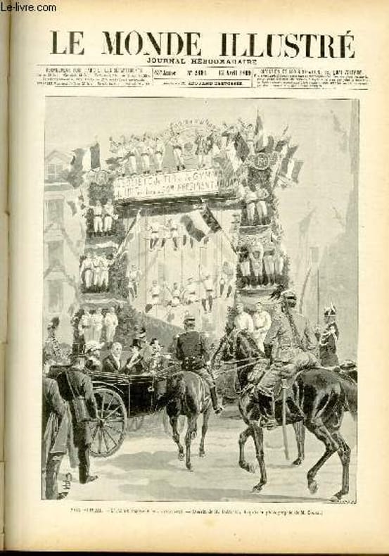 "Journal hebdomadaire. Sommaire : L'Arc de Triomphe des gymnastes. Montélimar - Le cortège sur le boulevard Mare-Desmarets. La maison de M. Loubet. Mme Loubet attendant sur la terrasse de la sous-préfecture l'arrivée de son fils. Les troupes attendant l'arrivée du Président. Inauguration du Vélodrome. M. Loubet embrassant sa mère. Le Congrès des socété savantes à Toulouse. Toulouse - Arrivée de M. Leygues à la gare Matabiau. M. Antonin Deloume. Saint-Bertrand-de-Comminges - Les stalles du choeur. - La cathédrale et vue générale. - Le tombeau de Hugues de Castellione. M. Théodore Ozenne. Albi - L'église Sainte-Cécile. M. Cartailhac. M. Deffes. Valcabrère - Léglise Saint-Just. M. Armand Viré. L'entrée du gouffre. L'escalier de 45 mètres. La rivière souterraine. L'intérieur du Grand Dome. Amiral Makaroff. Le ""Yermak"" en marche sur les glaçons agglomérés. Le ""Yermak"" en marche dans la rade gelée de Cronstadt. Un moment d'arrêt. La demoiselle d'honneur. Les soldats de la garde. Beaux-Arts - Chez le barbier. Le Vendredi-Saint des Pontgigaud - Illustrations de Paul Balluriau. Théâtre illustré - Mme de Lavalette, drame de M. Moreau, représenté sur le théâtre du Vaudeville. M. Bizarelli. L'inauguration du monument Pasteur. M. Derveloy. Paris - Festival donné au Trocadéro au bénéfice des victimes de Lagoubran. Lille - Inauguration de la statue de Pasteur. High Life in Monte Carlo. Classification Dewey : 70.4-Journalisme, chronique"