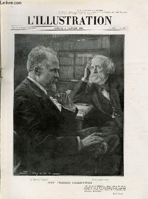 L'ILLUSTRATION. 4 janvier 1913. In-Folio. Broché. Bon état, Couv. convenable, Dos satisfaisant, Intérieur frais. 16 pages environ illustrées de nombreuses gravures en noir et blanc - Paginées de 1 à 16 - avec couverture + 16 pages publicitaires noir et blanc (les vieilles liqueurs Marie Brizard & Roger, la charmeuse, tissu de grande vogue.. ) - 2 photos disponibles: la page du numéro et une page publicitaire. . . . Classification Dewey : 70.4417-L'illustration / Figaro salon