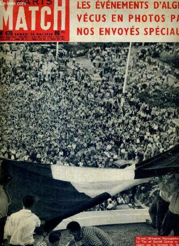 PARIS MATCH. 24 mai 1958. In-12. Broché. Bon état, Couv. convenable, Dos satisfaisant, Intérieur frais. 105 pages augmentées de nombreuses photos et illustrations en noir et blanc et en couleurs dans et hors texte - 1er plat illustré d'une photo en couleurs. . . . Classification Dewey : 70.49-Presse illustrée, magazines, revues
