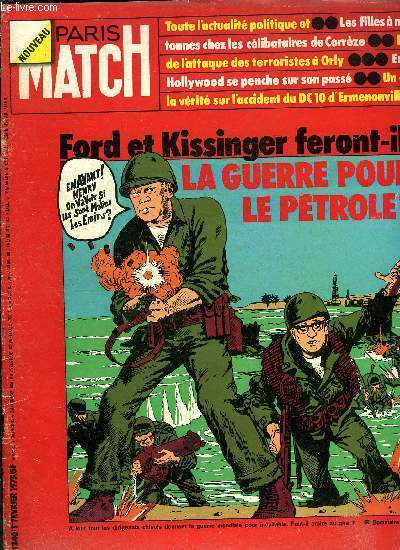 Sommaire : La guerre ?, Le général Beaufre envisage les différentes hypothèses de conflits possibles, Kissinger et Ford feront-ils la guerre pour le pétrole ? par Andrew Tobias, Sadate : moi aussi j'ai peur d'un nouveau conflit par Jacques Chapus, Le parti socialiste devient premier parti de France par Philippe Alexandre, Les photos inédites des terroristes a Orly, Le prof d'anglais de Giscard racfonte ses leçons a l'Elysée par Laurence Masurel, Charlot retrouve le Londres de son enfance Classification Dewey : 70.49-Presse illustrée, magazines, revues