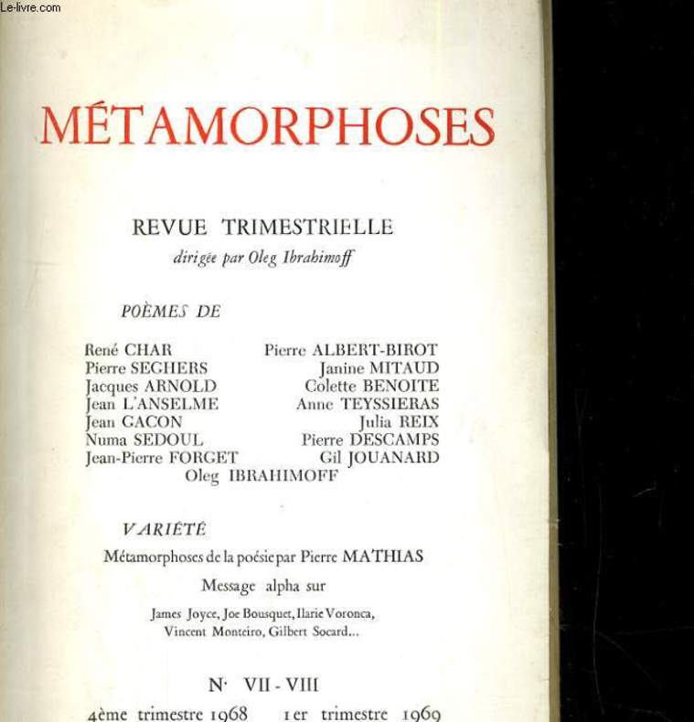 Poèmes de : René Char - Pierre Seghers - Jacques Arnold - Jean L'Anselme - Jean Gacon - Numa Sedoul - Jean-Pierre Forget - Pierre Albert-Birot - Janine Mitaud - Colette Benoitte - Anne Teyssieras - Julia Reix - Pierre Descamps - Gil Jouanard - Oleg Ibrahimoff / Variété : Métamorphoses de la poésie par Pierre Mathias. Classification Dewey : 841-Poésie