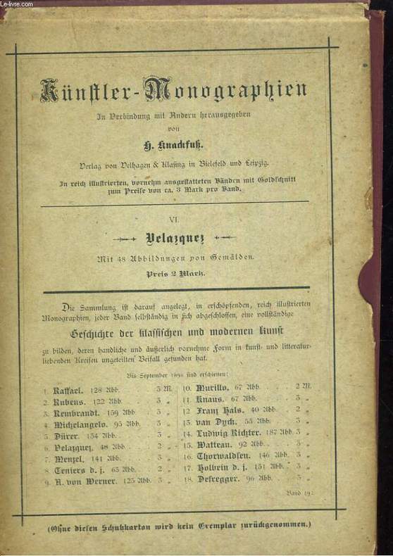 Bielefeld und Leipzig. 1898. In-8. Cartonnage d'éditeurs. Bon état, Couv. convenable, Dos satisfaisant, Intérieur frais. 64 p. - Texte en allemand - Tranche supérieure doré - Illustrations n&b in et hors texte.. . Sous Emboitage. . Classification Dewey : 750-La peinture et les peintres