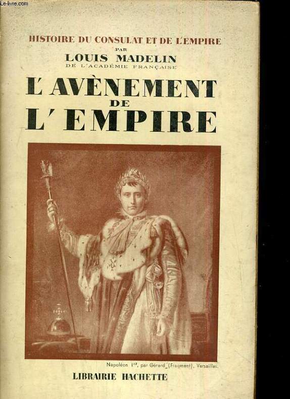 1945, Hachette, in-8 broché de 397 pages, couverture blanche illustrée en noir et blanc, titrage noir, Histoire du consulat et de l'Empire, Tome V, l'avènement de l'Empire | Etat : Etat moyen, couverture légèrement défraîchie, rousseurs intérieures, extérieures et sur tranches,coiffe supérieure absente, coiffe inférieure frottée, (Ref.: ref80708)