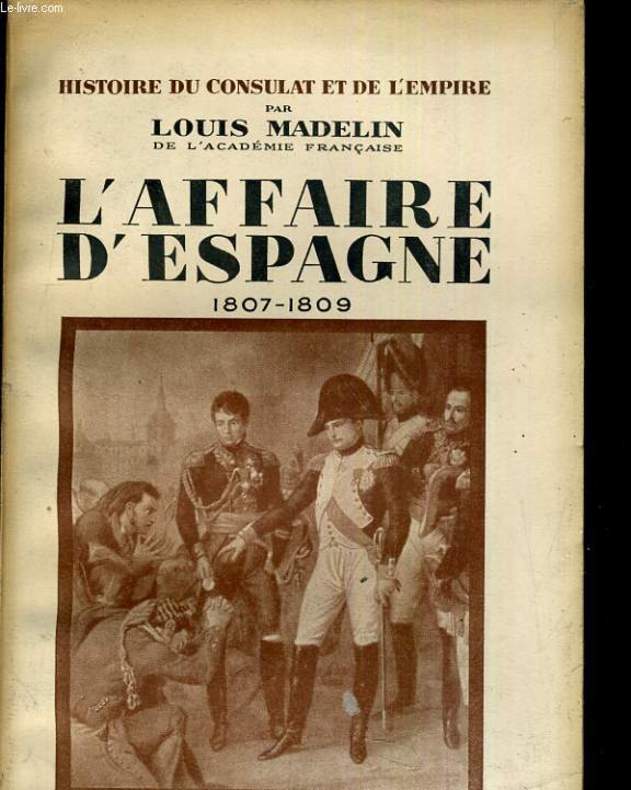 ? HISTOIRE DU CONSULAT ET DE L'EMPIRE, par Louis Madelin de l'Académie Française | L'AFFAIRE DESPAGNE | 1807-1809 [Monogramme]. Librairie Hachette [s.l.] [1943]. [Imprimerie Brodard et Tapin, Coulommiers, Paris]. In-8°. (22,5 x 14 cm) 333 pp. (dont f.t. et t.), 1 f.impr.n.ch.,Couverture crème souple et imprimée. Dos ridé et bruni. Usure légère de la couverture. Ex-libris à froid sur la page de faux-titre. Excellent état du contenu orné de lettrines noires. Édition originale. Tome VII de l'Histoire du Consulat et de l'Empire (XII volumes). Broché. [Empire] pm, II-1