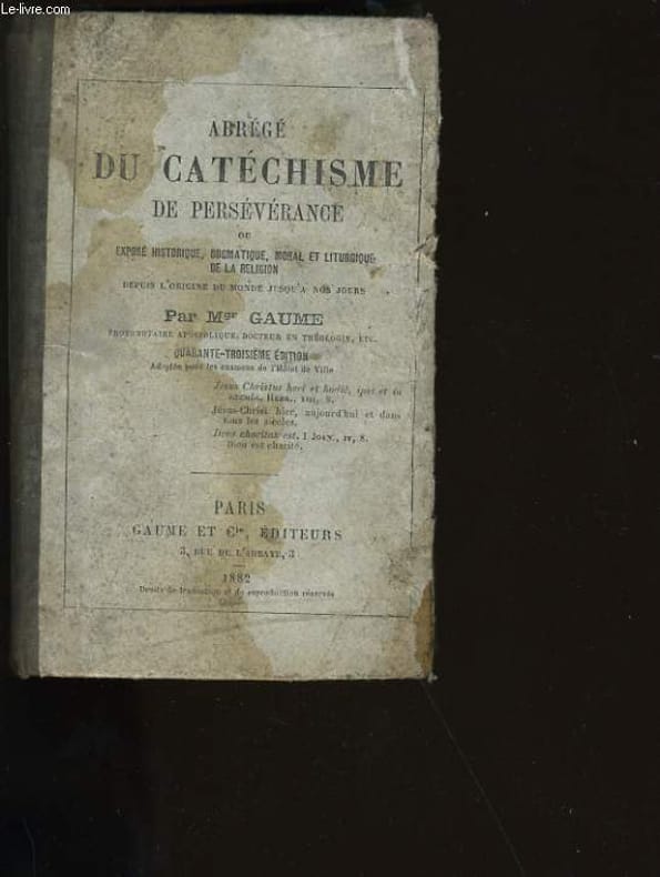 GAUME ET CIE. 1887. In-16. Cartonné. Etat d'usage, Plats abîmés, Dos satisfaisant, Intérieur acceptable. 504 pages + 8 pages.. . . . Classification Dewey : 268-Catéchisme