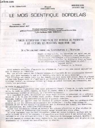 Mensuel. Périodique mensuel d'informations scientifique publié par l'Union Scientifique d'Aquitaine, Assiociation sans but lucratif (Loi de 1901). Classification Dewey : 908.447-Régionalisme : Aquitaine
