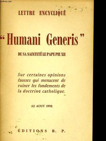 Petit broche sous papier cristal . Texte propre . 20 pages. LETTRE ENCYCLIQUE HUMANI GENERIS DE SA SAINTETE LE PAPE PIE XII SUR CERTAINES OPINIONS FAUSSES QUI MENACENT DE RUINER LES FONDEMENTS DE LA DOCTRINE CATHOLIQUE (12 AOUT 1950)