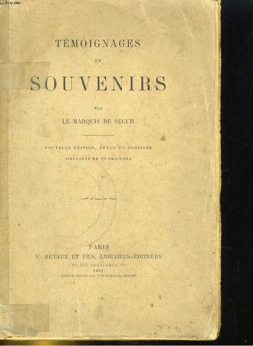 BRAY ET RETAUX. 1872. In-12. Broché. Etat d'usage, Couv. légèrement passée, Dos abîmé, Quelques rousseurs. 313 pages. Dos fendu. Tampons de bibliothèque.. . . . Classification Dewey : 848-Ecrits divers, citations, journaux intimes, souvenirs, mémoires