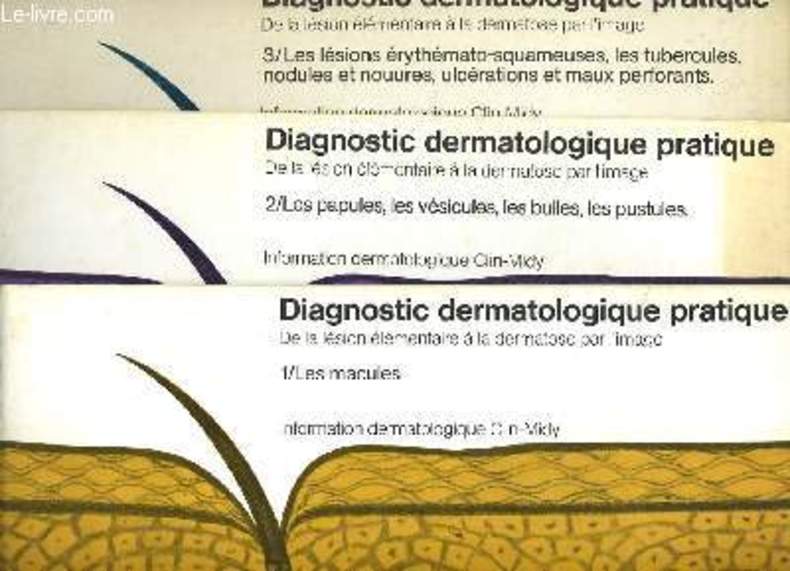 INFORMATION DERMATOLOGIQUE CLIN-MIDY. Non daté. In-4. Broché. Bon état, Couv. convenable, Dos satisfaisant, Intérieur frais. 1/ Les macules, 23 pages. 2/ Les papules, les vésocules, les bulles, les pustules, 23 pages. 3/ Les lésions érythémato-squameuses, les tubercules, nodules et nouures, ulcérations et maux perforants, 23 pages. Nombreux schémas et photos en couleurs, dans le texte.. . . A l'italienne. Classification Dewey : 616.5-Dermatologie