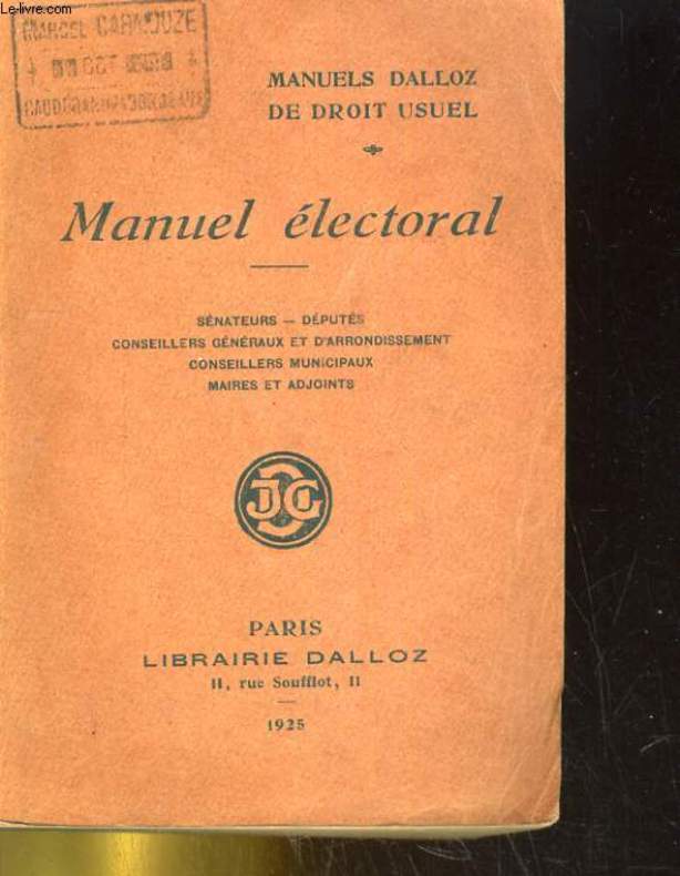 "DALLOZ. 1910. In-12. Broché. Etat d'usage, Couv. convenable, Coiffe en tête abîmée, Quelques rousseurs. VIII + 472 pages - une coupure de presse ""questions électorales"" collée sur le 2ème contre plat - tranches jaspées.. . . . Classification Dewey : 348-Lois, règlement, jurisprudence"