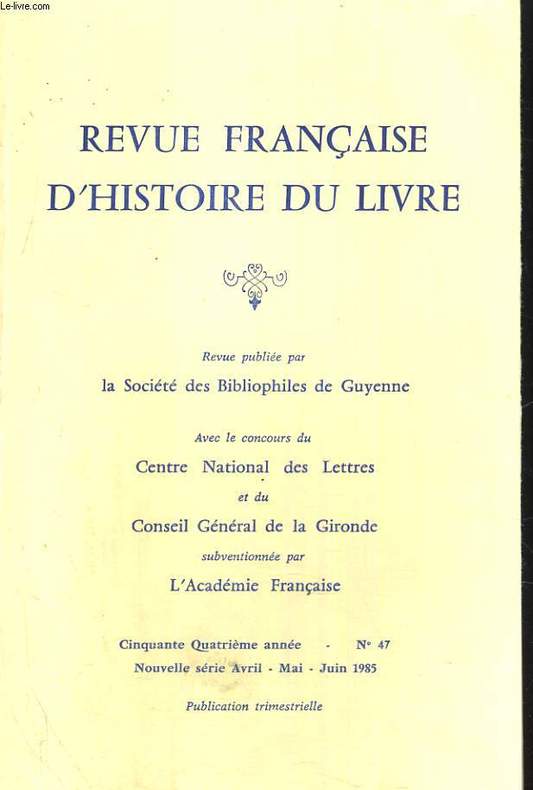 ... xviiE siècle. A.J. Tudesq: la naissance de la presse de la radiodiffusion entre les deux guerres mondiales. Y. Poutet: commentaires sur une thèse illustrée relative aux Abécédaires français. S. Jeune: Eugène Le Roy tel qu'en lui-même. Revue publiée par la Société des Bibliophiles de Guyenne. Avec le concours du Centre National des Lettres et du Conseil Général de la Gironde subventionnée par l'Académie Française. Publication trimestrielle. Classification Dewey : 2-Le livre