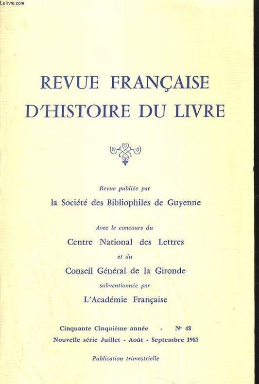 ... M. Meras : Manuscrits à peintures et livres rares à l'exposition Anne Beaujeu. / R. Darricau : Erasme éditeur de sa correspondance. L. Desgraves : Les thèses de l'Ecole des Chartrees sur l'histoire du livre en 1984. Revue publiée par la Société des Bibliophiles de Guyenne. Avec le concours du Centre National des Lettres et du Conseil Général de la Gironde subventionnée par l'Académie Française. Publication trimestrielle. Classification Dewey : 2-Le livre