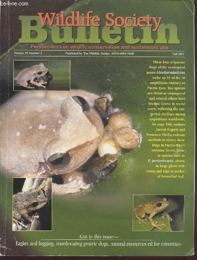 The Wildlife Society. 2001. In-4. Broché. Bon état, Couv. convenable, Dos satisfaisant, Intérieur frais. Paginé de 769 à 1013. Nombreuses photos et illustrations en noir et blanc et couleurs dans le texte. Contre-plats illustrés en couleurs. Texte en anglais sur deux colonnes.. . . . Classification Dewey : 420-Langue anglaise. Anglo-saxon