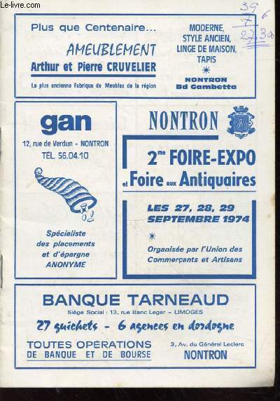 Non précisé. Non daté. In-8. Broché. Bon état, Couv. convenable, Dos satisfaisant, Intérieur frais. Livret de 18 pages publicitaires des commerces et artisans de la ville de Nontron. Relié par deux agraffes. Une annotation à l'encre sur la première page.. . . . Classification Dewey : 908.447-Régionalisme : Aquitaine