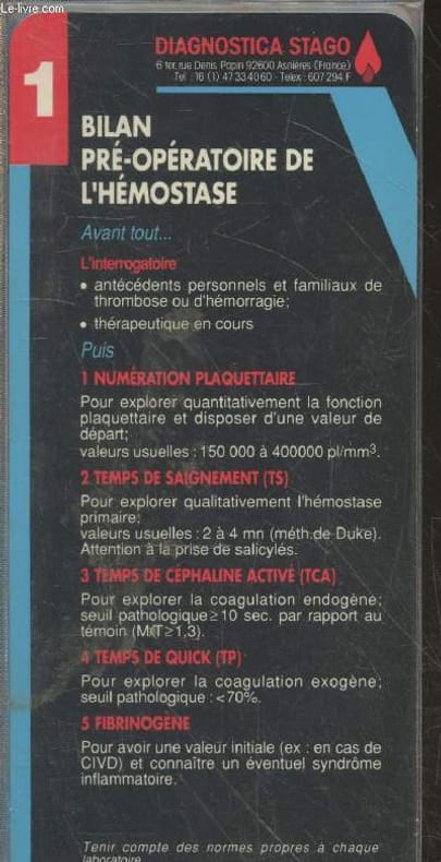 Diagnostica Stago. 1989. In-8. En feuillets. Bon état, Couv. convenable, Dos satisfaisant, Intérieur frais. Dépliant de 10 pages.. . . . Classification Dewey : 610-Sciences médicales. Médecine