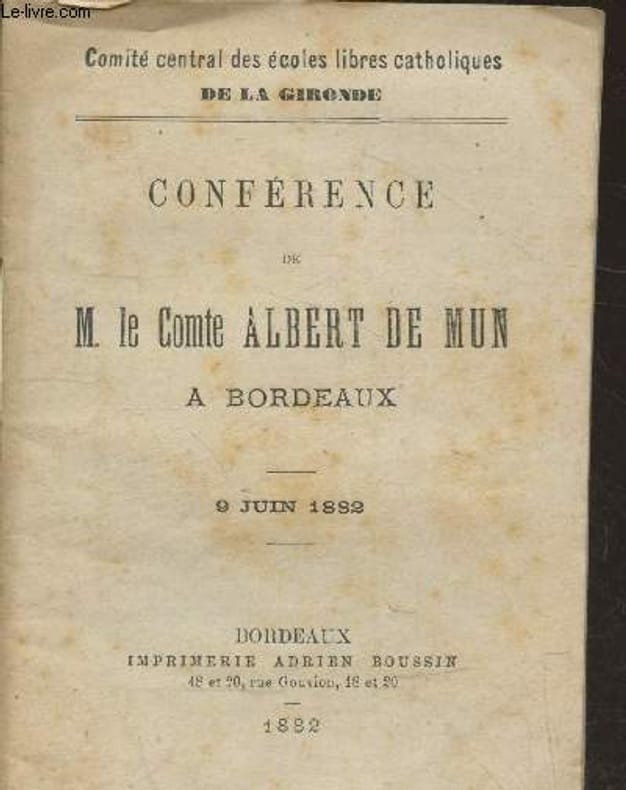 Imprimerie Adrien Boussin / Comité central des écoles libres catholiques de la Gironde. 1882. In-16. Broché. Bon état, Couv. convenable, Dos satisfaisant, Rousseurs. 46 pages. . . . Classification Dewey : 260-Théologie sociale chrétienne