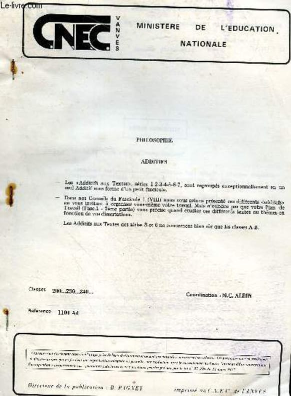MINISTERE DE L'EDUCATION NATIONAL / CNEC vanves. NON DATE. In-4. Broché. Etat d'usage, Couv. légèrement passée, Agrafes rouillées, Quelques rousseurs. Environ 100 pages - quelques annotations sans conséquence sur la lecture - Pages agrafées. . . . Classification Dewey : 100-PHILOSOPHIE ET DISCIPLINES CONNEXES