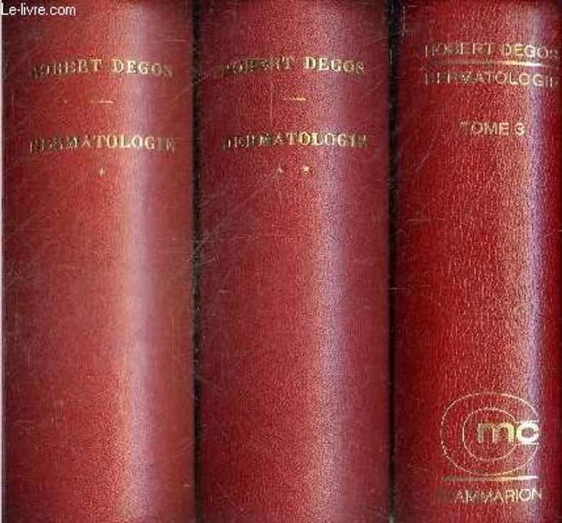 "Tome 1 de ""histologie et chimio physiologie de la peau"" au chapitre VIII ""pustules"" + Tome 2 du chapitre IX ""tubercules"" au chapitre XVI ""naevi angiomes"" + Tome 3 du Chapitre XVII ""kystes et tumeurs benignes"" au Chapitre XXIII "" affection des ongles"" // chapitre I: ""erythemes"", chapitre II: ""purpuras, telangiectasies, capillarites"", chapitre IV ""dermatoses erythemato-suqameuses, chapitre V"" papules"", Chapitre XVIII ""tumeurs malignes"" - Chapitre XIX ""hematodermies"" - Chapitre XX ""prurits, prurigos, lichenifications, parasitoses"" - Chapitre XXI "" affections des muqueuses"" - Chapitre XXII "" affections du cuir chevelu"" - Chapitre XXIII "" affection des ongles"" ... Classification Dewey : 616.5-Dermatologie"