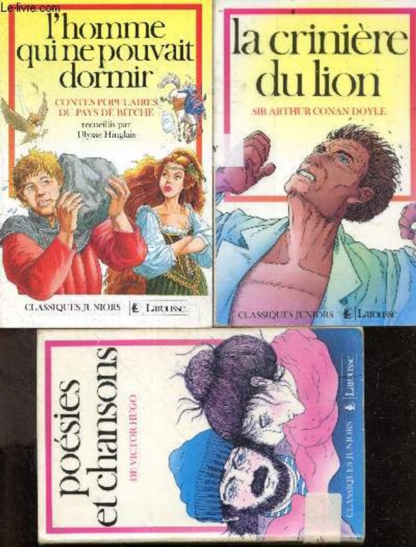 LAROUSSE CLASSIQUES JUNIORS. 1986-1987. In-12. Broché. Etat d'usage, Couv. légèrement passée, Dos satisfaisant, Quelques rousseurs. 63 + 47 + 78 pages - Exemplaires de bibliotheque avec divers tampons/ annotations/ etiquettes sans conséquence sur la lecture + deux des ouvrages sont recouvert d'un film plastique adhésif transparent - Dos insolés - Nombreux dessins, dans et hors texte, en noir/blanc et vert ou bleu selon les livres. . . . Classification Dewey : 843.0692-Livres d'enfants