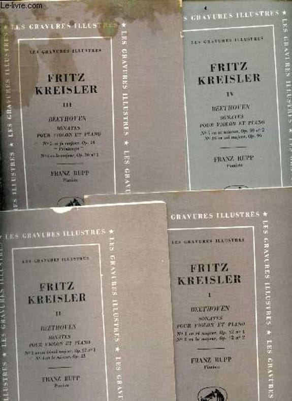 "Fritz Kreisler - Lot de 4 volumes: I+ II+ III+ IV- Beethoven Sonates pour violon et piano : n°1 en re majeur, Op12 n°1/ N°2 en la majeur majeur, Op12 N°2/ N°3 en mi bemol majeur, Op12 N°3/ N°4 en la mineur Op23/ N°5 en fa mineur Op24 ""printemps""/ N°6 en la majeur Op30 N°1/ N°7 en ut mineur Op30 N°2/ N°10 en sol majeur Op96 Classification Dewey : 780.92-Musiciens, concertistes"