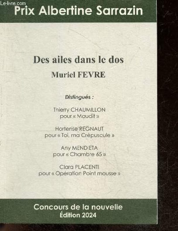 "Prix Albertine Sarrazin : "" Des ailes dans le dos "" de Muriel Fevre + "" Maudit "" de Thierry Chaumillon + "" Toi, ma crepuscule "" de Hortense Regnaut + "" Chambre 65 "" de Any Mendieta + "" Operation Point Mousse "" de Clara Placenti - Presentation de la laureate Muriel Fevre - Le jury - Le pouvoir de l'imaginaire - Un humaniste descendu de l'Hortus par Claire Pascal Brocardi + Biographie d'Albertine Sarrazin - Concours de la nouvelle edition 2024 Classification Dewey : 840.092-XXI ème siècle"