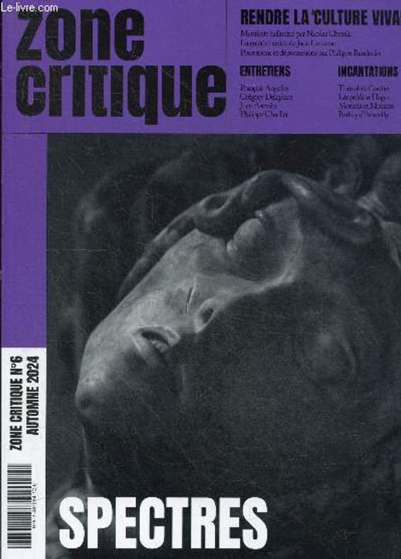 Zone critique N°6 automne 2024- Spectres - entretiens: francois angelier, gregory delaplace, juan asensio, philippe charlier- Incantations: theophile gautier, leopoldine hugo, moravia & morante, barbey d'aurevilly- Rendre la culture vivante: manifeste hallucine par nicolas chemla, la galeire hantee de jade lanzone, possessions et depossessions par philippe baudoin - portrait d'une voyante, les larmes de la madonne, enquete dans un chateau hanté, apparitions et disparitions du fantome novo ... Classification Dewey : 70.49-Presse illustrée, magazines, revues