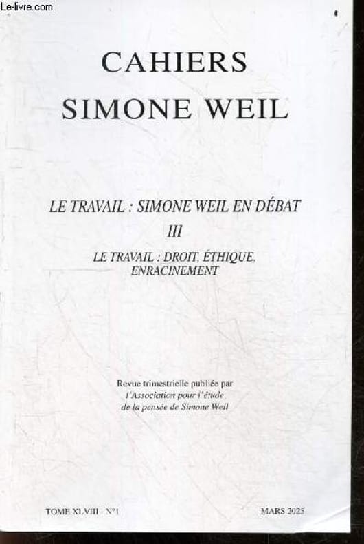 EMMANUEL GABELLIERI - STEFANIA TARANTINO - MINE MICHEL - MAYLIS DUPONT - FABIEN MATHURIN ENYEGUE ABANDA - COLLECTIF /// Cahiers Simone Weil - Mars 2025, Tome XLVIII N°1- Le travail : Simone Weil en debat III, le travail: droit, ethique, enracinement- L'intelligence naturelle du travail chez S. Weil- S. Weil face a Bataille & Bergson- Ontologie du travail et ethique des olbigations envers l'etre humain, la philosphie de l'enracinement de S. Weil, S. WEIL une parole sur le droit pour le monde du travail contemporain, le travail la vie la mort, relire S. Weil a partir des feministes de la substance, ... Classification Dewey : 70.49-Presse illustrée, magazines, revues