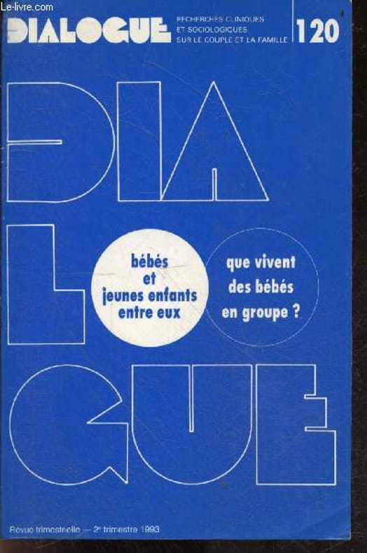 RECHERCHES CLINIQUES ETSOCIOLOGIQUES SUR LE COUPLE ET LA FAMILLE // Dialogue N°120, 2e trimestre 1993 - Bebes et jeunes enfants entre eux, que vivent des bebe en groupe? A chaque bebe son style de socialisation, ou le bebe dans le groupe de pairs a la creche- Bebe amis, bebe ennemis, bebe indifferent ente eux: une etude a la creche- Groupe de jeunes mere avec un enfant: un travail psychique d'ouverture- Du groupe lieu de solitude et de violence au groupe de communication harmonieuse- Le pacte empoisonne entre la famille et la creche:les divers groupes d'appui du bebe- Un jardin d'enfant therapeutique- Comment les jeunes enfants organisent ils leurs jeux ensembles ?, Processus d'etayage et autonomisation chez le jeune enfant - Pour aider le petit enfant a passer du cercle familial a la sphere sociale, un lieu intermediaire ... Classification Dewey : 70.49-Presse illustrée, magazines, revues