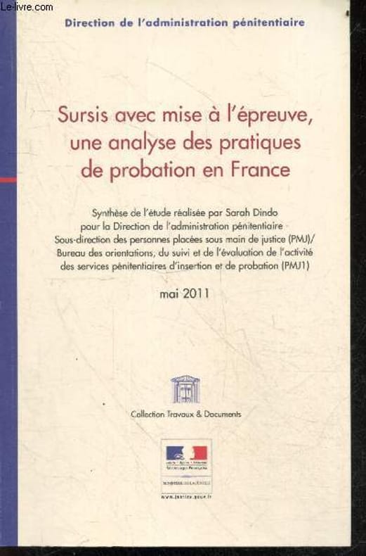 Sursis avec mise a l'epreuve, une analyse des pratiques de probation en France - Collection Travaux & Documents- Synthese de l'etude realisee par Sarah Dindo pour la direction de l'administration penitentiaire, sous direction des personnes placees sous main de justice (PMJ) / Bureau des orientations, du suivi & de l'evaluation de l'activite des services penitentiaires d'insertion & de probation (PMJ1) Classification Dewey : 365-Prisons