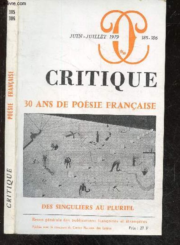 "SOMMAIRE : Anne-Marie Albiach : éblouissement alternatif par Serge Velay/ Yves Bonnefoy : la poésie entre deux mondes par Jean Starobinsky/ Andre du bouchet aux prises avec l'impossible parole par Yves Peyre/ Danielle Collobert ""cri ou comme brûle jamais dit"" par Jacques Roubaud/ Jean Daive ""le neutre dans une chambre immobile"" par Liliane Giraudon/ Michel Deguy "" qu'il faut toujours faire deux choses a la fois (au moins)"" par Yves Michaud/ Pierre Pachet ""gaffe injure attention""/ Jacques Dupin les corps communicants par Philippe Denis Classification Dewey : 70.49-Presse illustrée, magazines, revues"