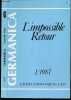 "L'impossible retour - La figure du Heimkehrer dans les lettres & les arts allemands & scandinaves du XXe siecle- Casanova l'impossible retour a venise dans l'aventurier et la cantatrice de Hofmannsthal & Le retour de casanova de Schnitzler- Georg Trakl: les poemes du non retour- L'exotisme fantasque de H.H. EWERS- Le retour au pays d'une generation perdue dans La fuite sans fin de Joseph Roth- Nelly Sachs ou le refuge de la langue- Ruckkehr und vergebliche hoffnung, zu peter Huchels gedicht heimkehr- Le theme du retour d'exil dans la trilogie adenauerienne de Wolfgang Koeppen- ""Es gibt nur das nirgendwo..."": Wim Wenders' travels ...- Aksel Sandemose un outsider persecute par lui meme, un fugitif revient sur ses pas (extrait) par Georges Ueberschlag // GENEVIEVE ROUSSEL- ALFRED STRASSER- PIERRE GIRAUD- PIERRE VAYDAT- ANDRE COMBES- JEAN DANIEL KREBS- JEAN JACQUES POLLET- LUDWIG VOLKER... Classification Dewey : 70.49-Presse illustrée, magazines, revues"