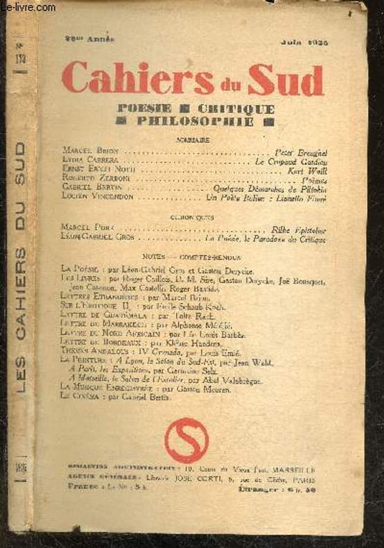 SOMMAIRE : Peter Breughel par Marcel Brion- Le crapaud gardien par Lydia Cabrera- Kurt Weill par Ernst Erich Noth- Poemes par Roberto Zerboni- Quelques demarches de Piltokin par Gabriel Bertin- Un poeme italien: Lionello Fiumi par Lucien Vincendon- Rilke epistolier par Marcel Pobe- La poesie, le paradoxe du critique par Leon-Gabriel Gros- Notes / comptes rendus : Le cinema par Gabriel Bertin, Lettre de bordeaux par Kleber Haedens, Sur l'erotique II par Emile SCHAUD-KOCH ... Classification Dewey : 70.49-Presse illustrée, magazines, revues